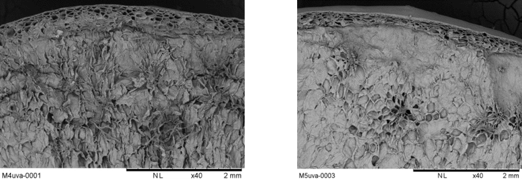 Imagen 2.- Corte transversal en baya de uva de mesa cv. Blanc Seedless. Se puede observar a simple vista la diferencia entre la constitución de la piel de la baya y de la pulpa, donde los tejidos se ven mucho más consistentes en la fruta con la aplicación del producto en base a silicio Quick-Sol®, lo que es concordante con el mayor porcentaje de materia seca y firmeza medida en las bayas tratadas con respecto al testigo.