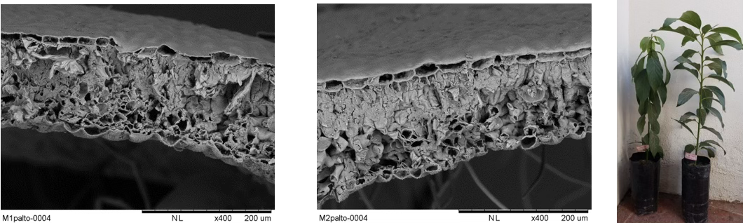 Imagen 1.- Corte transversal de hoja de palto, pi. Mexícola (Fotos corresponden a ensayo realizado en Vivero Alihuen). Las fotos de las plantas de donde fueron sacadas las hojas corresponden a las cultivadas en el vivero, planta de la derecha Testigo y planta de la izquierda con Quick-Sol®, el estado de las plantas es después de estar 1 mes sin riego durante el mes de Julio, 2018.