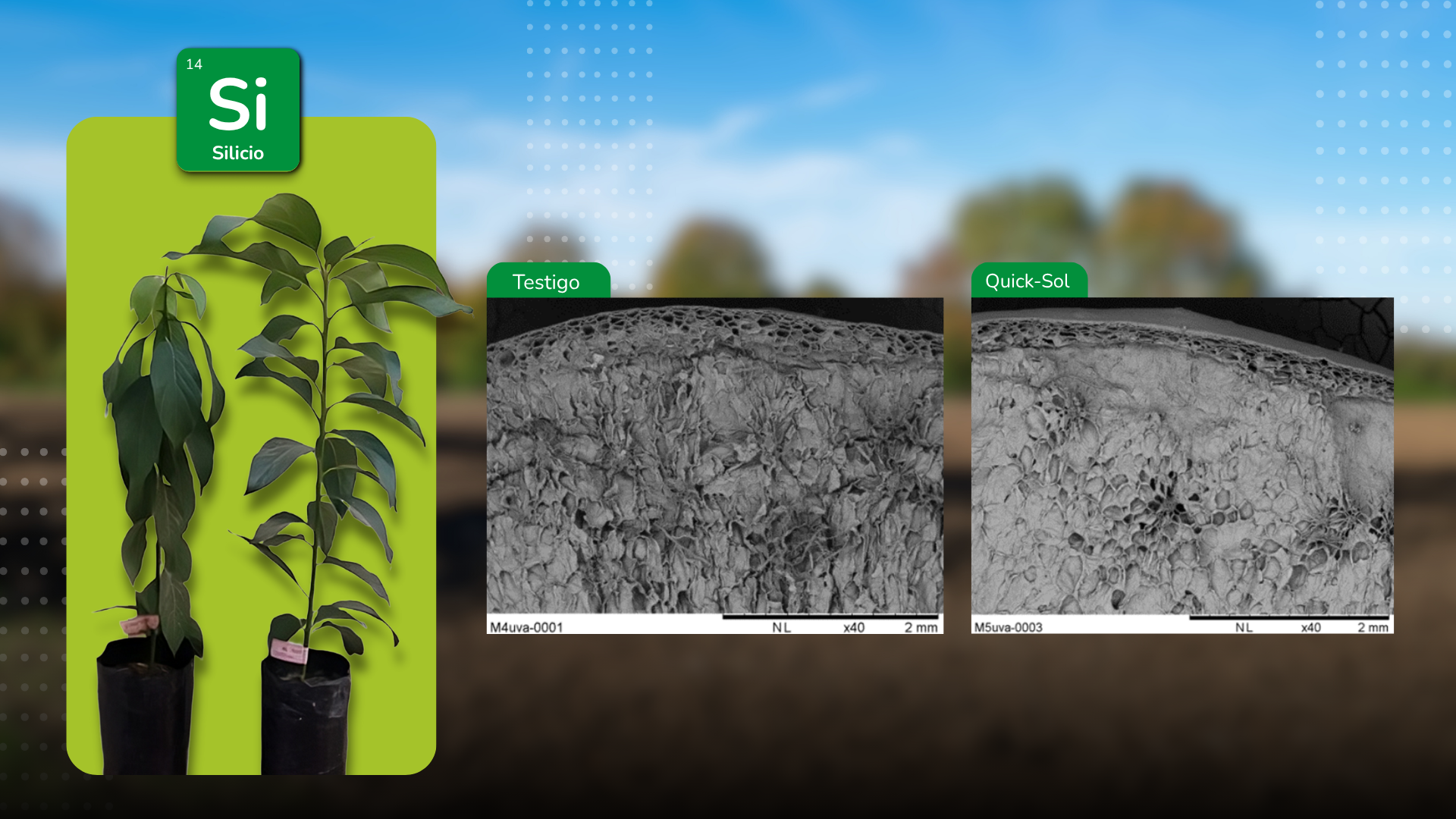 El silicio actúa como un modulador fisiológico que fortalece los mecanismos naturales de defensa de las plantas frente a los principales factores de estrés abiótico. Su efecto se ha documentado en cultivos frutales como vid, frutilla, arándano y cerezo.
